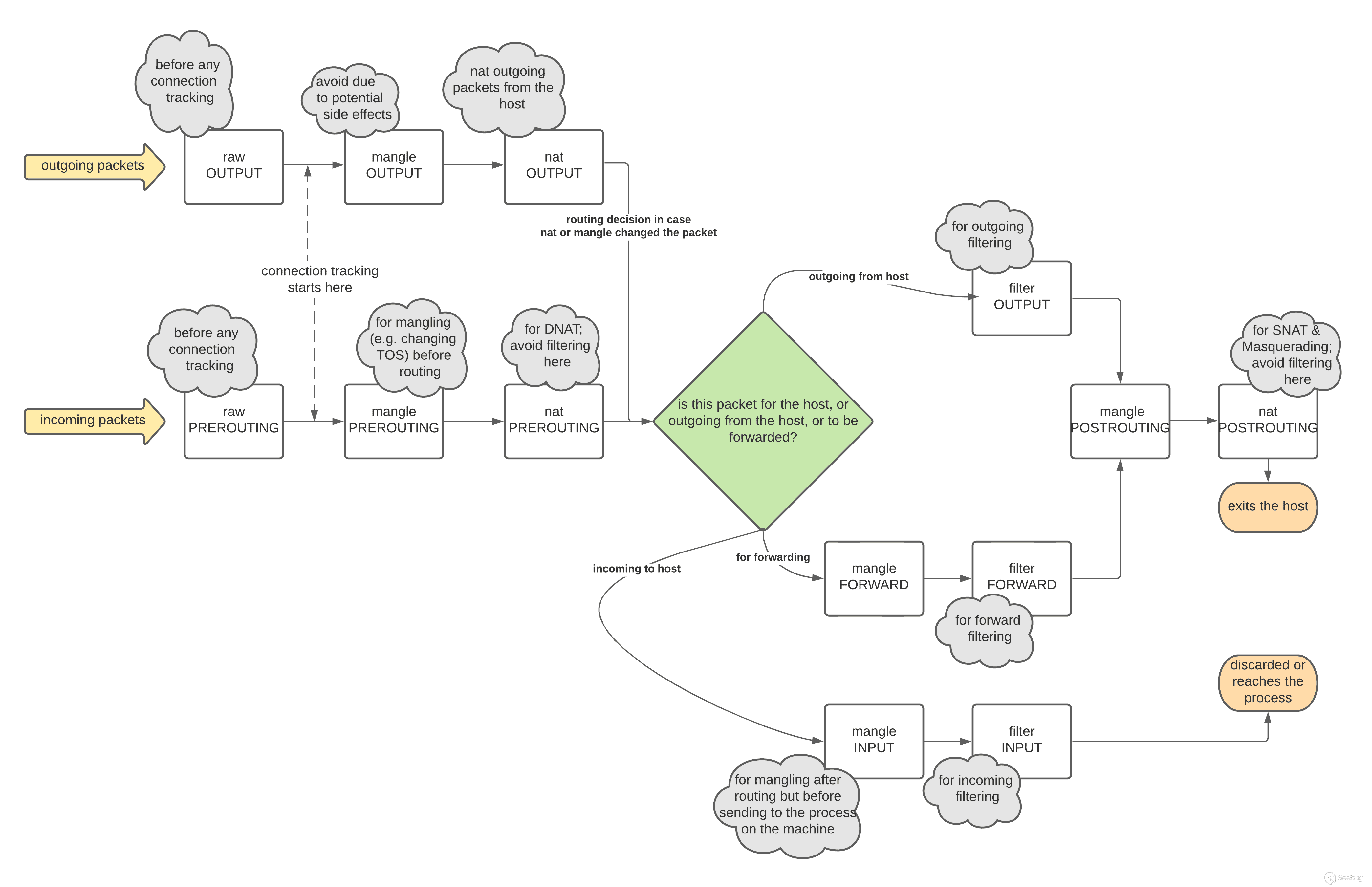 - OUTPUT: 表示數據包在本地生成,并準備發送到遠端;