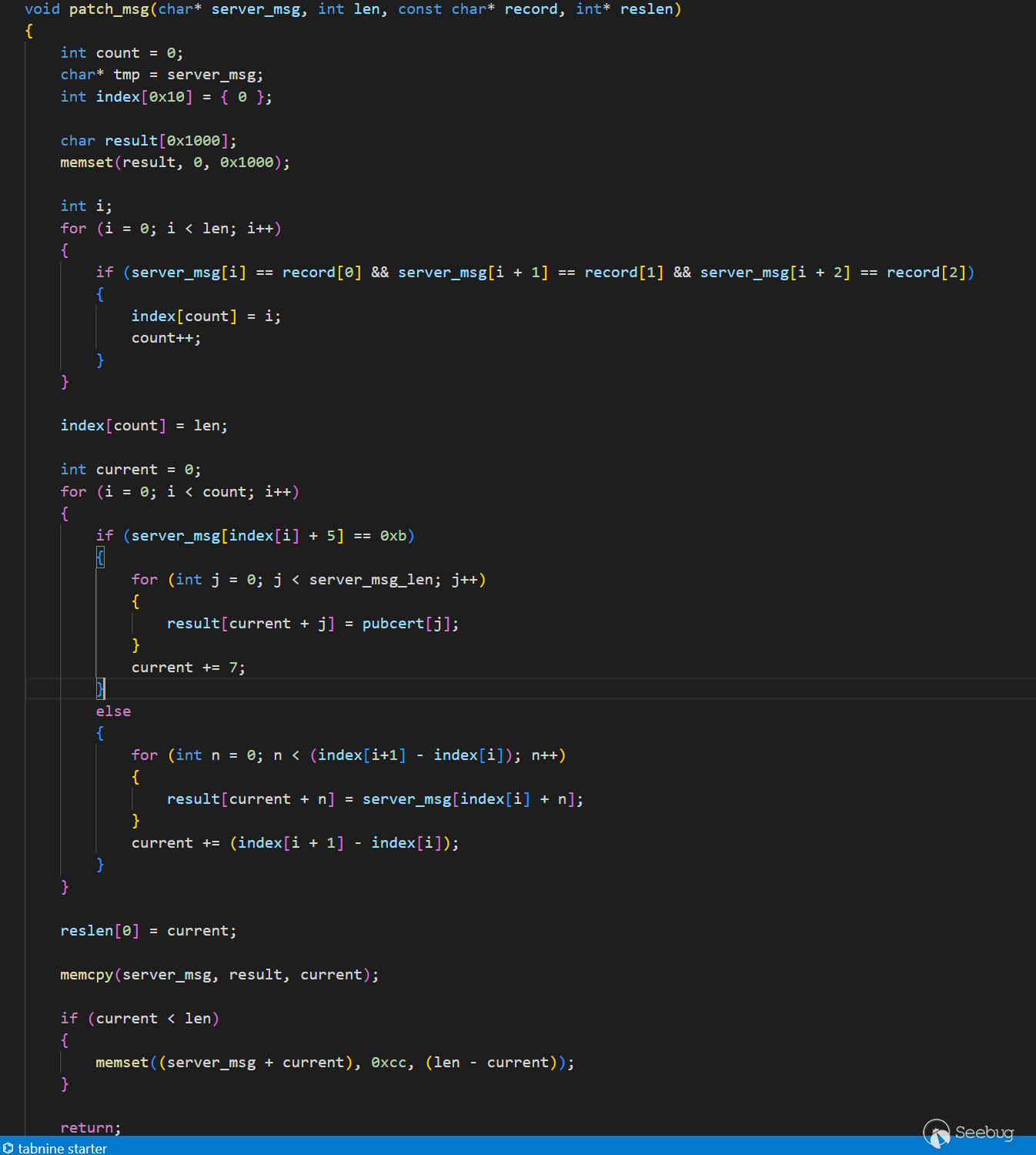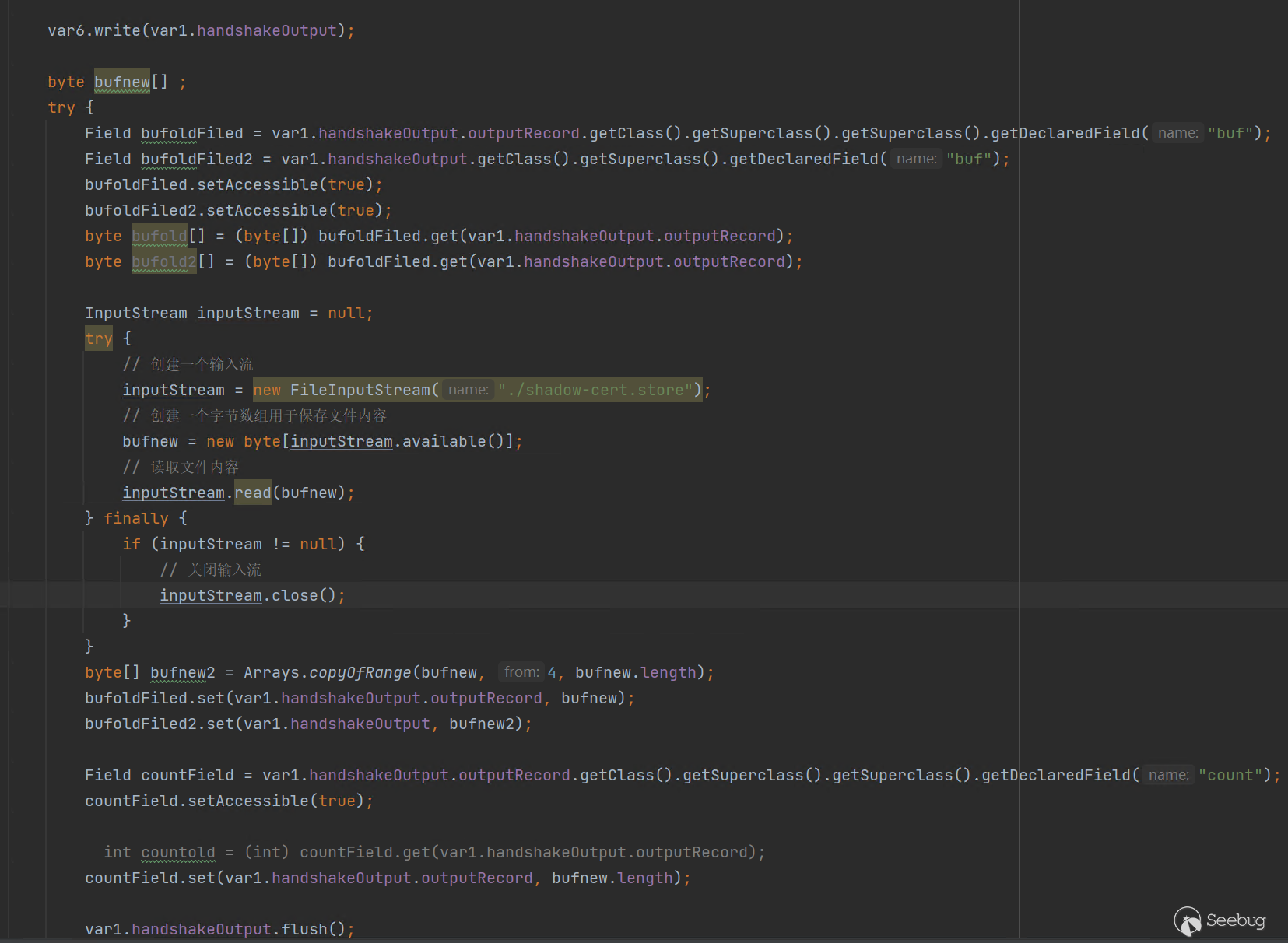 對于CS Server來說想要實現這部分功能,需要覆蓋JDK類,這里用到了 java 提供的 endorsed 技術,可以簡單理解為 -Djava.endorsed.dirs 指定的目錄面放置的 jar 文件,將有覆蓋系統 API 的功能。我們找到 CertificateMessage.java 文件中 T12CertificateProducer 類的 onProduceCertificate 方法,這個方法是處理tls握手時返回 sever hello 消息中的證書數據部分的,我們在其發送證書信息之前,替換成白名單域名的證書。這里給出演示DEMO,實際項目實現需完成更多細節。