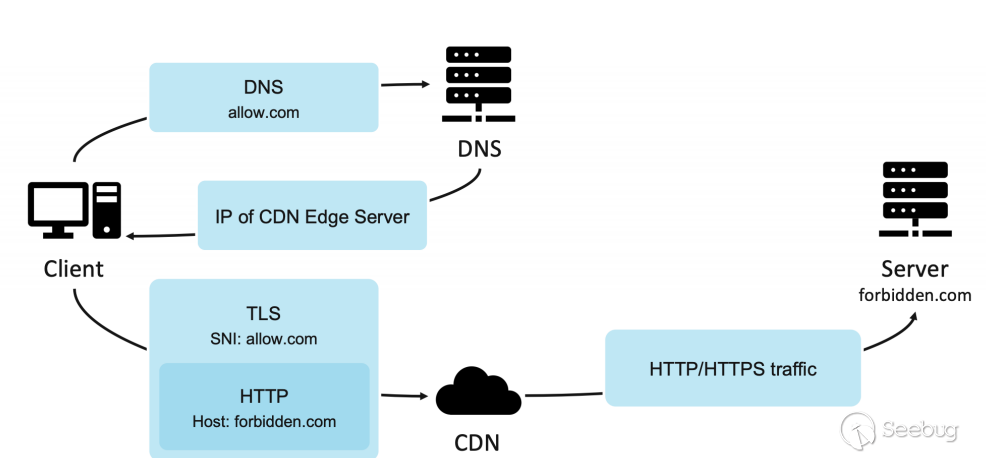 一般使用域前置時,把CDN作為白名單域名,當作一個靶子,中間設備所觀測到的是一直與CDN通信: