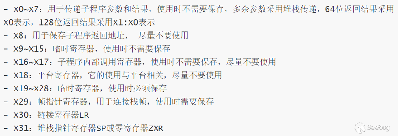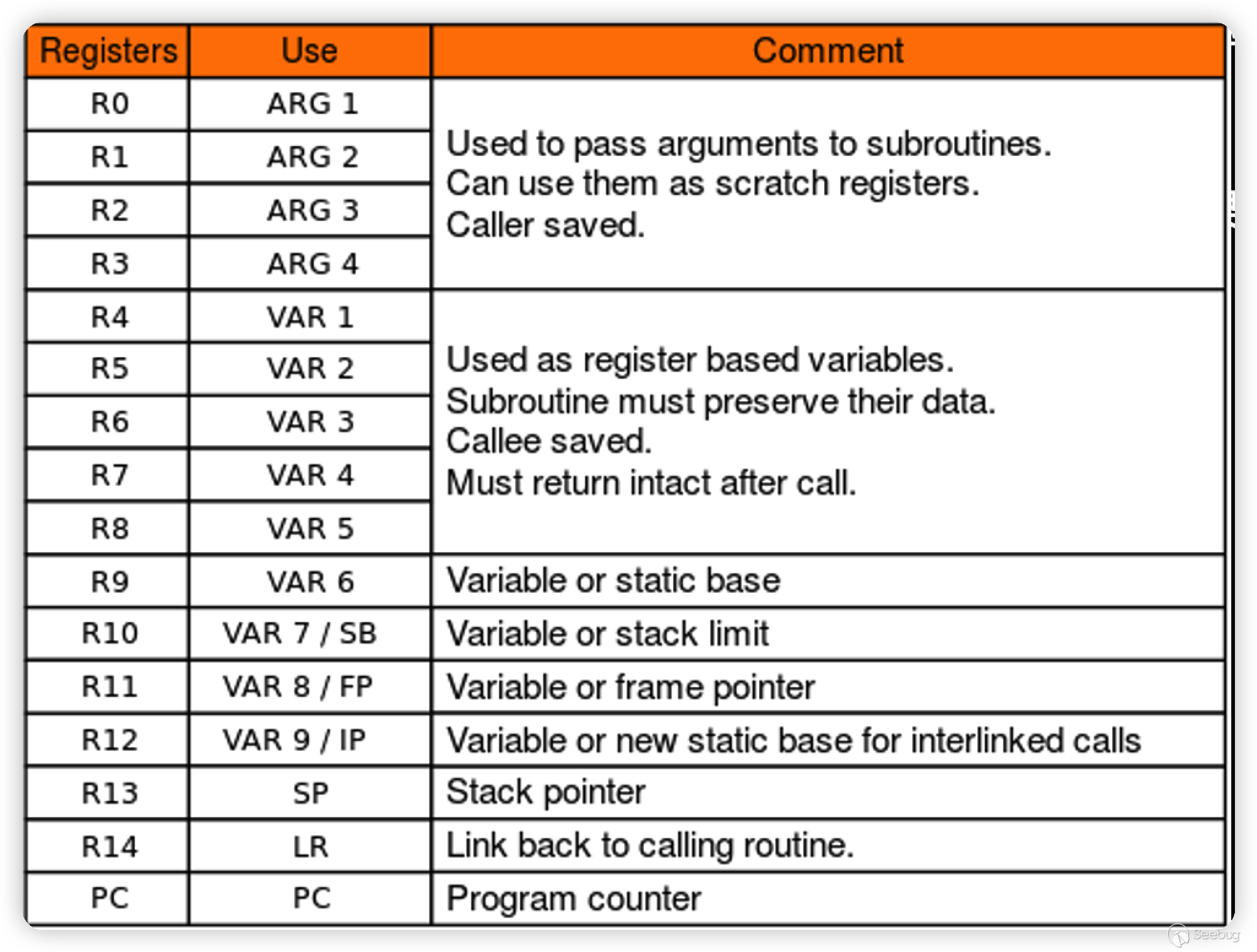 - R11跟蹤用作幀指針的堆棧的邊界,函數調用約定指定函數的前四個參數存儲在寄存器 R0-R3 中