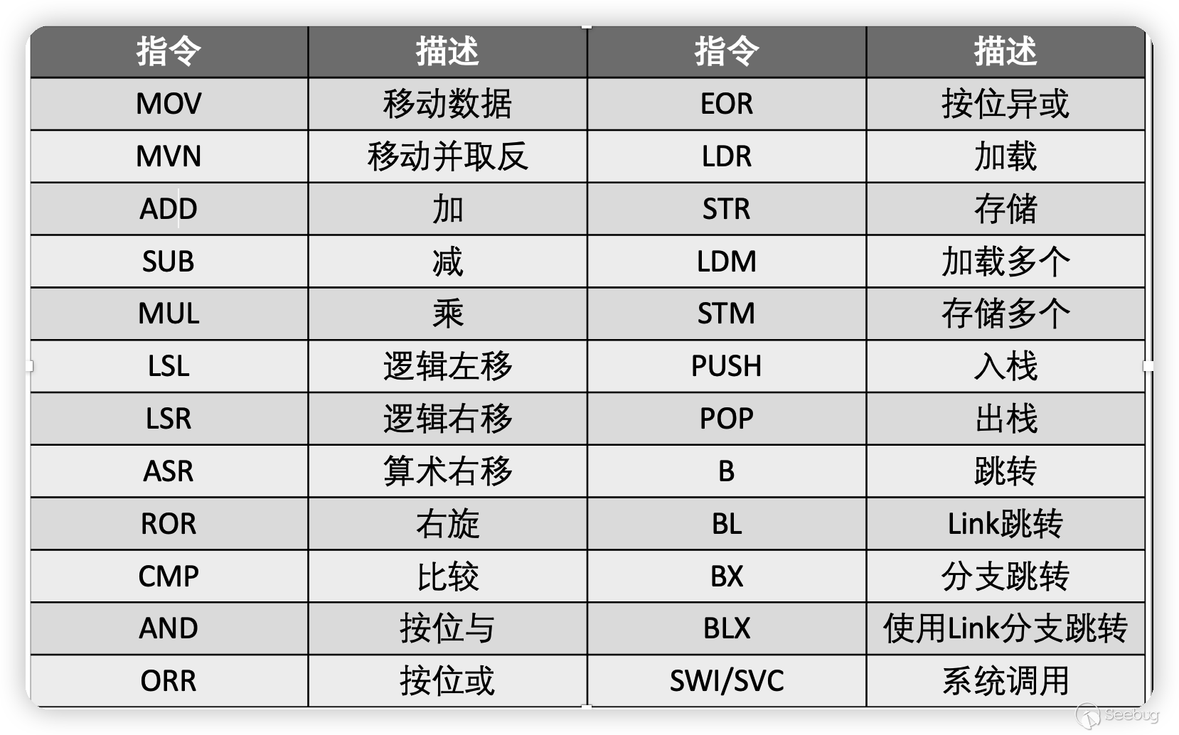 [!NOTE] MNEMONIC:指令簡稱 {S}:可選后綴,如果指定了S,即可根據結果更新條件標志 {condition}:執行指令需滿足的條件 {Rd}:用于存儲指令結果的寄存器 Operand1:第一個操作數,寄存器或立即數 Operand2:可選,可以是立即數或者帶可移位的寄存器