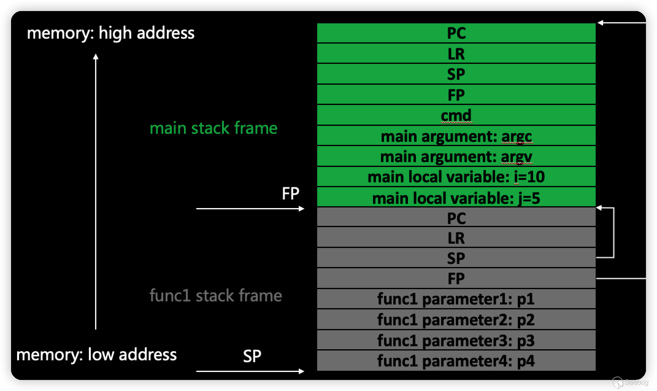 FP就是棧基址,它指向函數的棧幀起始地址;SP則是函數的棧指針,它指向棧頂的位置。ARM壓棧的順序依次為當前函數指針PC、返回指針LR、棧指針SP、棧基址FP、傳入參數個數及指針、本地變量和臨時變量。