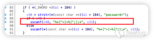 此處存在一個未經驗證的 sscanf,它會將 v40 中存儲的值按照 "%*[^=]=%[^;];*" 格式化輸入到 v33,但是并未驗證字符串長度,因此此處會產生一個棧溢出。