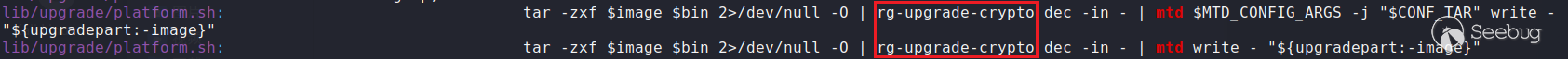 很顯然,此處的rg-upgrade-crypto自然就是我們所要找到固件解密程序,并找到它的路徑/usr/sbin/rg-upgrade-crypto,對其逆向分析。