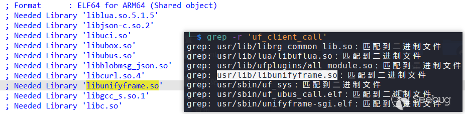 然而,分析libuflua.so可以發現,Lua中所調用的client_call函數,其實是uf_client_call函數,這是在其他共享庫中定義的函數。查找對比一下,不難發現這個函數定義在/usr/lib/libunifyframe.so中。