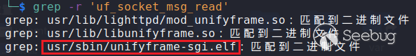既然這里采用uf_socket_msg_write進行數據發送,那么肯定有某個地方會使用uf_socket_msg_read進行數據接收,再進一步處理。匹配一下,一共三個文件,很容易鎖定/usr/sbin/unifyframe-sgi.elf文件。又發現在初始化腳本/etc/init.d/unifyframe-sgi中,啟動了unifyframe-sgi.elf,即說明unifyframe-sgi.elf一直掛在進程中。因此,我們可以確定unifyframe-sgi.elf就是接收libunifyframe.so所發數據的文件(這里采用了Ubus總線進行進程間通信)。