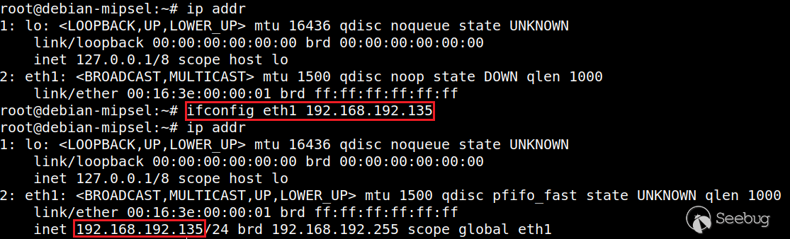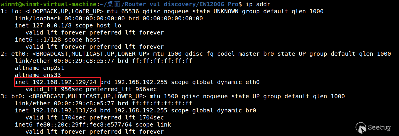 在正式開始仿真前,需要先進行網絡配置。用ip addr或ifconfig命令查看一下主機的ip,如下圖為eth0(或ens33)對應的192.168.192.129,若是沒有,手動用sudo ifconfig eth0 xx.xx.xx.xx分配一下即可。