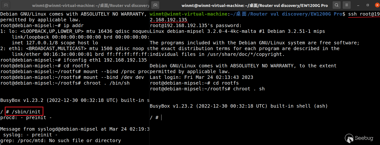 以上都是些用qemu對設備仿真模擬的基本操作,接下來正式開始對這款設備的固件進行仿真。首先,對于OpenWRT來說,內核加載完文件系統后,首先會啟動/sbin/init進程,其中會進一步執行/etc/preinit和/sbin/procd,進行初步初始化。這當然也是仿真模擬的第一步,在啟動/sbin/init后,會卡住掛在進程中,我們可以再ssh開一個新窗口進行后續操作,也可以用/sbin/init &將其作為后臺進程執行。