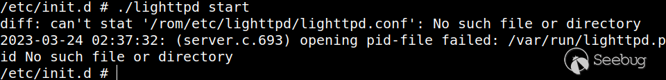 顯然,我們最開始肯定是需要啟動httpd服務的,對應/etc/init.d/lighttpd初始化腳本。用/etc/init.d/lighttpd start命令啟動服務后,發現缺少了/var/run/lighttpd.pid文件:
