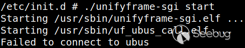 接著,我們需要啟動unifyframe-sgi.elf了,對應/etc/init.d/unifyframe-sgi的初始化腳本。用/etc/init.d/unifyframe-sgi start直接啟動后,報錯Failed to connect to ubus: