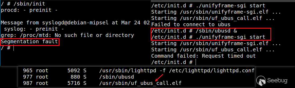 按照上述步驟啟動后,可以發現進程中有了uf_ubus_call.elf,但是仍然沒有unifyframe-sgi.elf,同時procd守護進程收到了一個Segmentation fault段錯誤的信號,意味著啟動unifyframe-sgi.elf的時候出現了段錯誤。