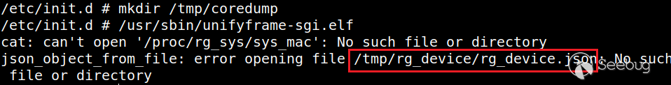 創建/tmp/coredump目錄后,運行/usr/sbin/unifyframe-sgi.elf程序,因缺少/tmp/rg_device/rg_device.json文件報錯: