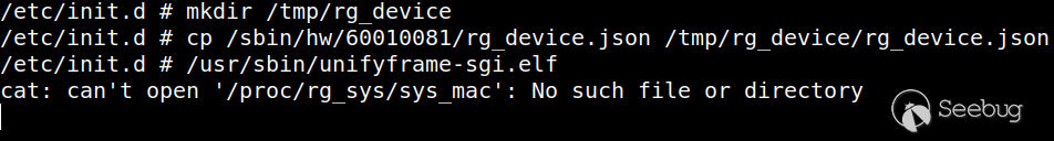 可以發現除了/sbin/hw/default/rg_device.json中都有此字段,這里隨便復制一個/sbin/hw/60010081/rg_device.json到/tmp/rg_device目錄下。之后再執行/usr/sbin/unifyframe-sgi.elf程序,就發現沒有新的報錯,執行成功了。