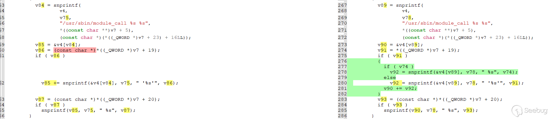 由上述可知,若這里的v74不為空,則存放著stringtojson函數過濾后的內容,否則說明不存在單引號或反引號,也就未通過stringtojson函數進行過濾。又由于stringtojson函數處理后會帶有雙引號,故若包含了單引號或反引號,該命令在新版固件中實際為/usr/sbin/module_call set networkId_merge "{...}"。雖然由于JSON數據中雙引號得是\"才行(stringtojson函數也會將雙引號編碼為\\u0022),無法閉合繞過雙引號,但是在雙引號內是可以用反引號或$()執行命令的,而這里只過濾了反引號,并未過濾$(),也就給了攻擊者可趁之機。
