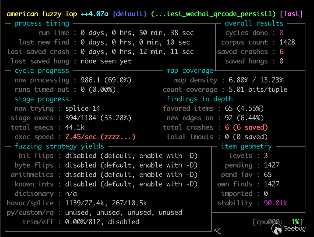 這里我指定了 AFL_CUSTOM_MUTATOR_ONLY=1,不需要 AFL 自身的變異,因為 AFL 的變異是基于原始語料的,而我并不希望在原始的圖片二進制層級進行變異,否則就又回到了最初的場景。現在我們每次生成一張隨機的二維碼圖片,且肯定是合法的 PNG 格式,避免遭遇圖片解碼時的異常。初始語料我也設置為表示坐標的點而不是圖片。