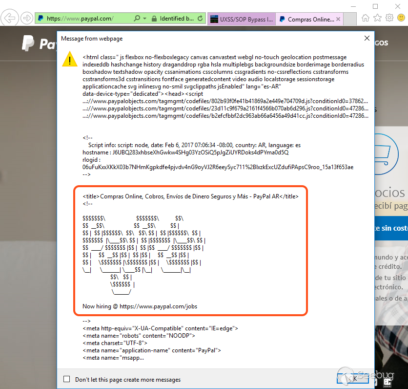 有一種在目標網站有機會加載之前,對任意窗口/iframe 注入 HTML/Script 的方法,而無視其域。例如,假設我們打開一個帶有服務器重定向至 PayPal 的新窗口。在重定向發生之前,我們仍可以訪問該窗口,但一旦重定向加載了新的 URL ,我們就無法訪問了,對嗎?實際上,當重定向發生時,IE 渲染新內容之前銷毀了 window 的每一個元素。