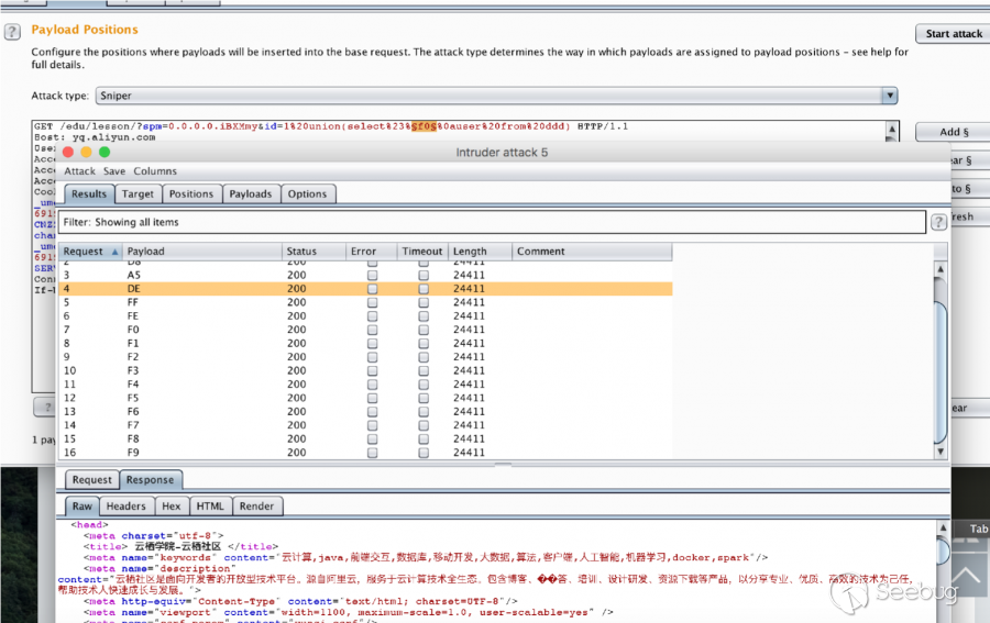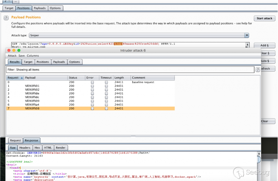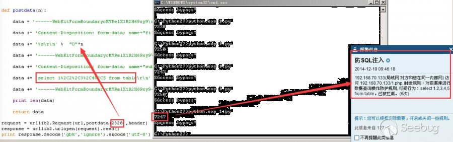 云鎖在開始檢測時先判斷包的大小是否為7250byte以下,n為填充包內容,設置n大小為2328時,可以正常訪問頁面,但是會提示攔截了SQL注入