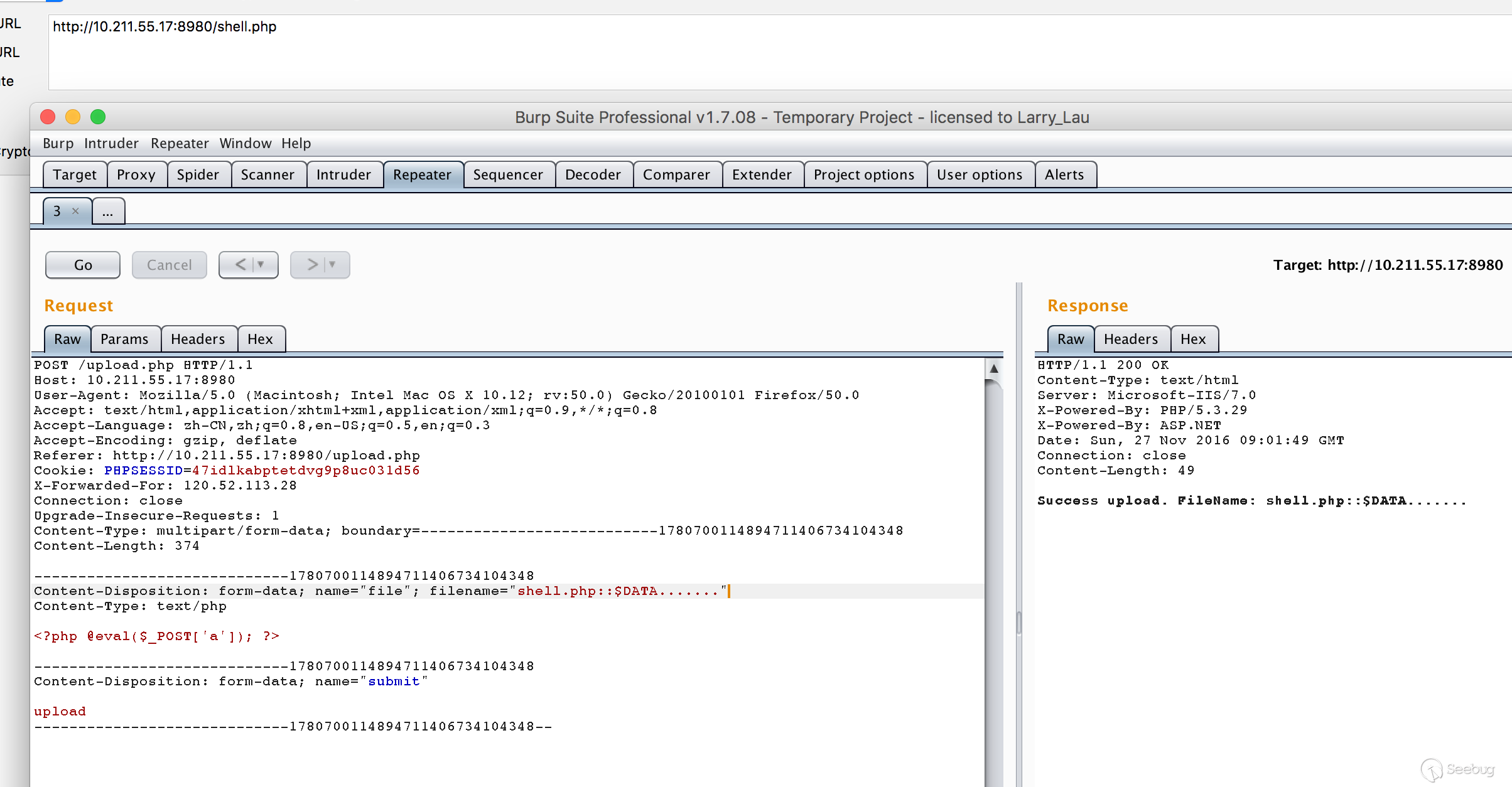 Windows在創建文件時,在文件名末尾不管加多少點都會自動去除,那么上傳時filename可以這么寫shell.php......也可以這么寫shell.php::$DATA.......。