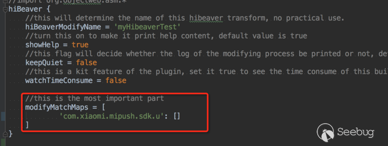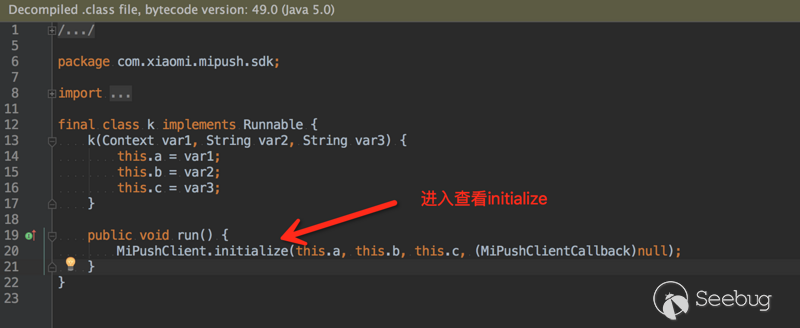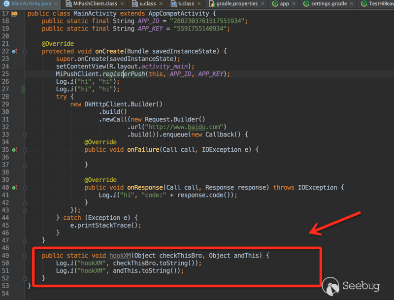 如果你看到了和我一樣的內容,那說明初步配置成功。 可以看到,使用插件后會輸出一段友好的幫助內容,還是中英文的,告訴我們可以直接拷貝作為初始配置,這個幫助輸出也是可以關閉的。 下面我們正式開始嘗試Hook小米推送SDK,首先,找出其業務邏輯中的一個節點。 首先,引入小米推送,這個過程不贅述了,blablabla,引入成功! 眾所周知,使用小米推送需要先在代碼中調用如下: