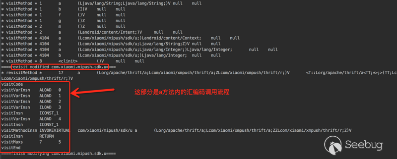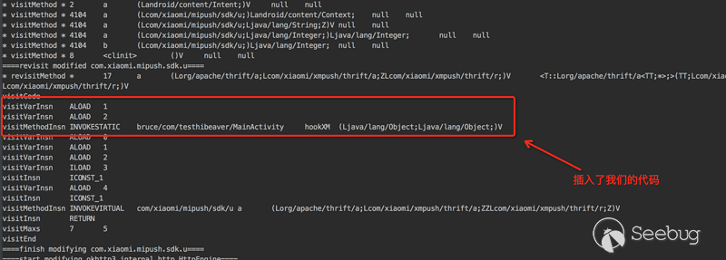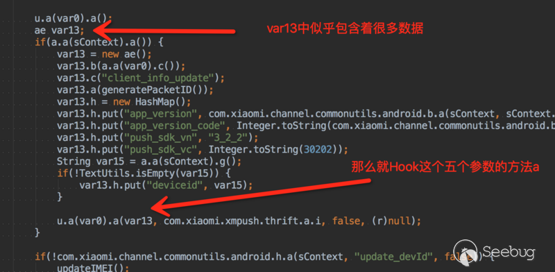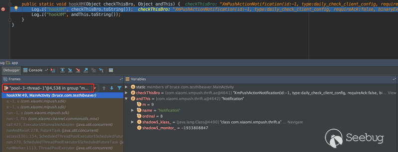 上面可以看到,無論是debug還是log輸出都可以抓到想要的參數了。 因為小米推送是商業產品,這里不便于探索太多內容,但是通過hibeaver這個插件可以比較方便的進行類似的研究。
