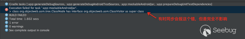 hibeaver所體現的技術,并沒有特別大的價值,僅僅作為工具來講比較方便易用,有助于學習研究Jar中的邏輯,和學習應用Java匯編碼。除此之外,還有幾個應用場景:1.修改引用SDK中的一些bug或者提高其效率;2.獲得必要的SDK的一些關鍵調用時機,通過hook建立回調;3.欺騙SDK、關閉或減少SDK中不受控制的網絡傳輸。不一而足,還是很有趣、很有想象空間的。 目前存在的問題,如下,這個除了偶爾同步報錯之外沒有影響,編譯正常: