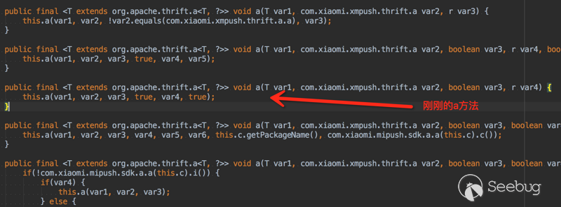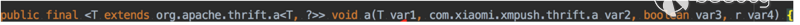 是一個泛型方法,眾所周知泛型只存在于編碼階段,編譯后是沒有泛型的,其實傳入的參數的實際類型為org.apache.thrift.a,最終找到其方法描述應該為: