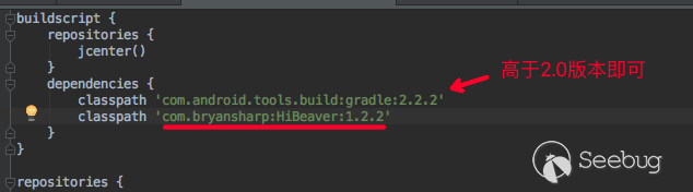 這里需要注意的是,目前該插件僅支持Android gradle編譯插件2.0及以上的版本。 然后,在你的App項目gradle配置底部或任意位置加入如下代碼: