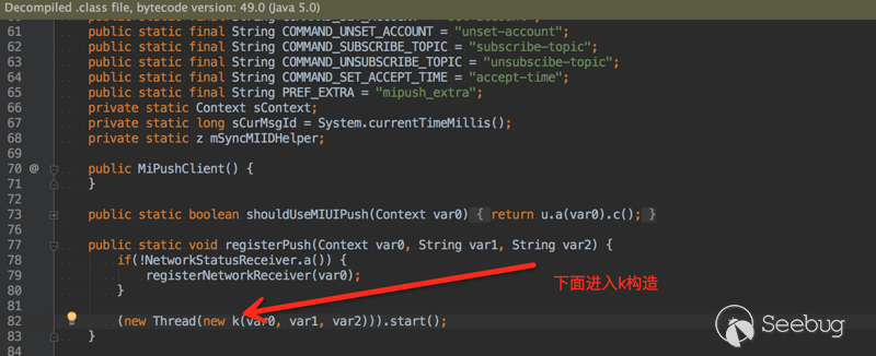 這個代碼應該會調起本地長連接的建立、注冊服務器等流程。假如我們出于學習的目的,想研究其中的流程,試舉一例,先從查看其反編譯的代碼開始,找一個切入的節點,如下: 首先進入查看MiPushClient.registerPush這個方法: