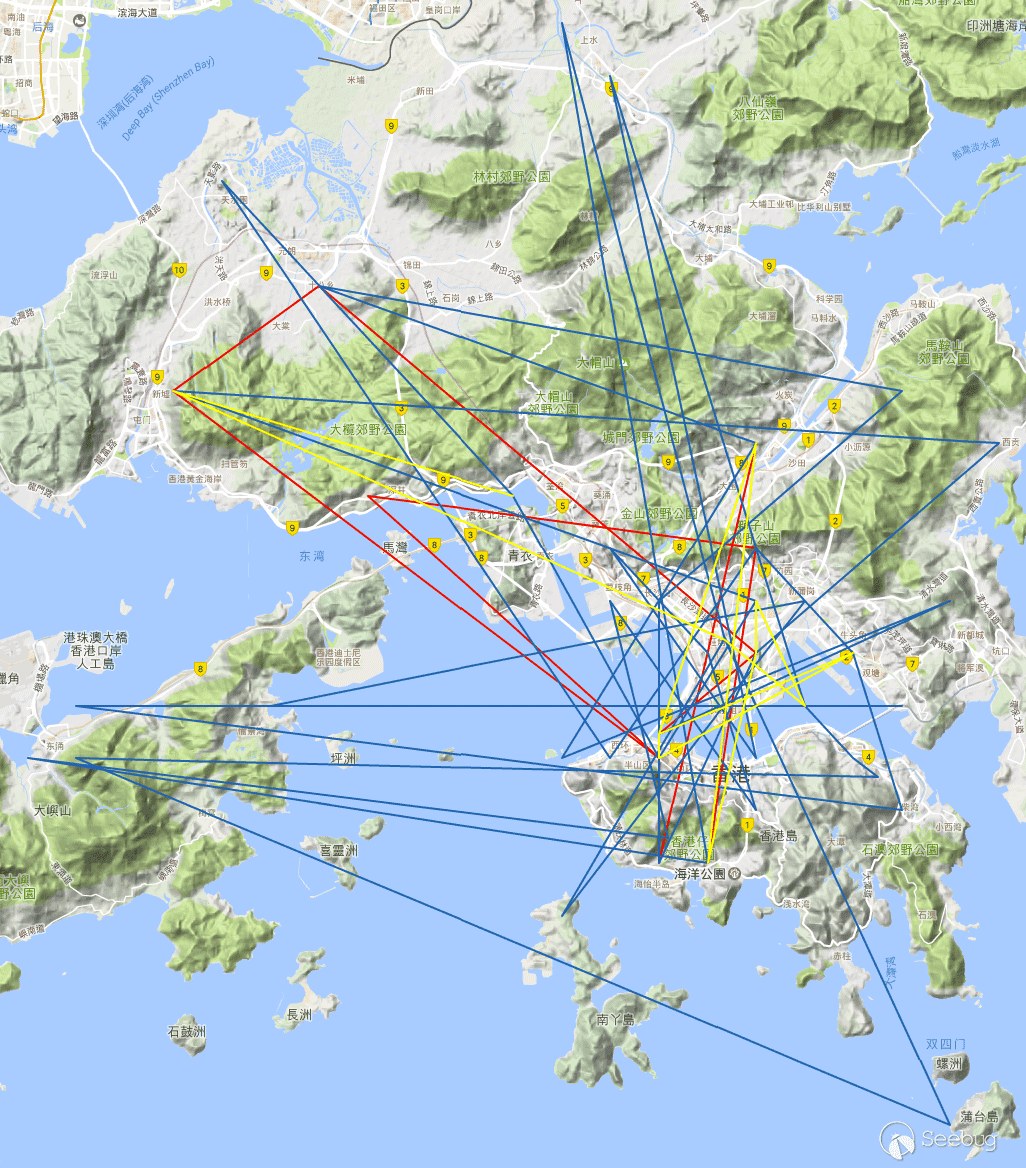 附上一張香港分析后的圖, 紅色代表沒有密碼的wifi, 黃色代表WEP加密方式, 藍色代表WPAPSK方式。