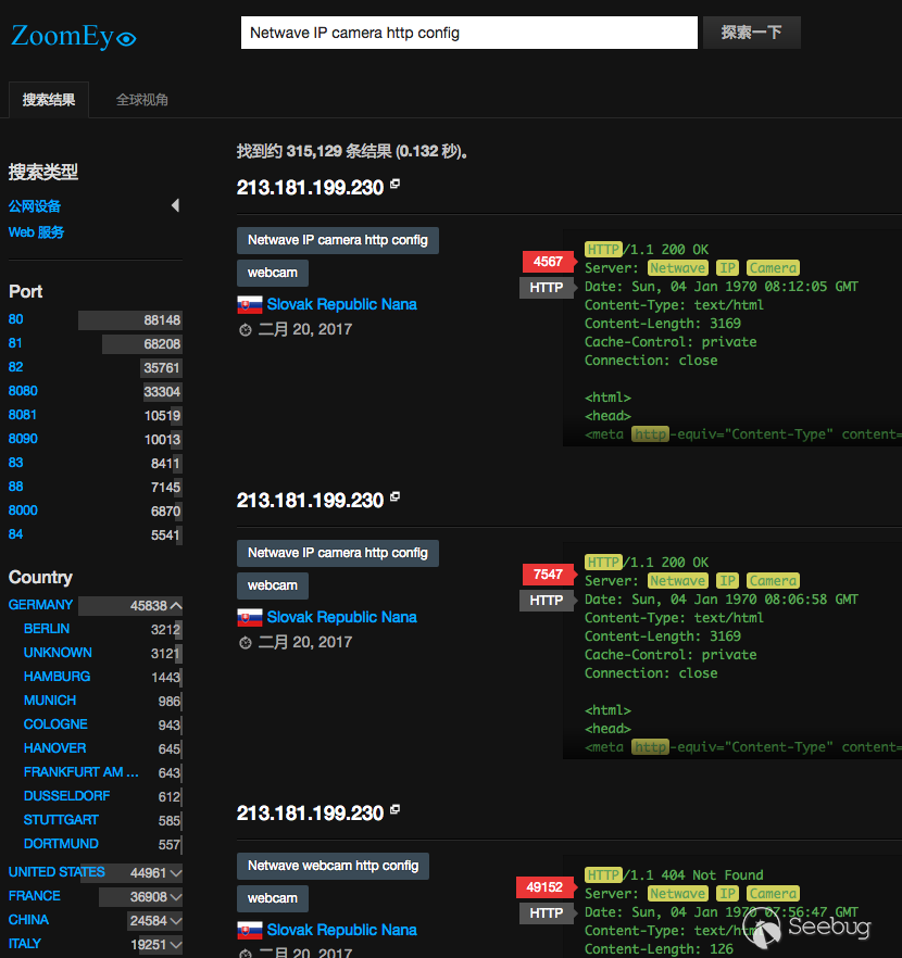 先來看一張使用 ZoomEye 搜索的結果, 可以看到搜索到 315,129 條。