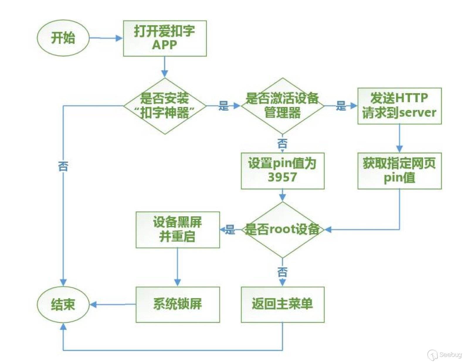 盤古實驗室在獲取到惡意樣本后,在安卓模擬器上進行了測試,還原其鎖屏觸發流程及技術原理。下圖為惡意鎖屏的觸發流程圖。