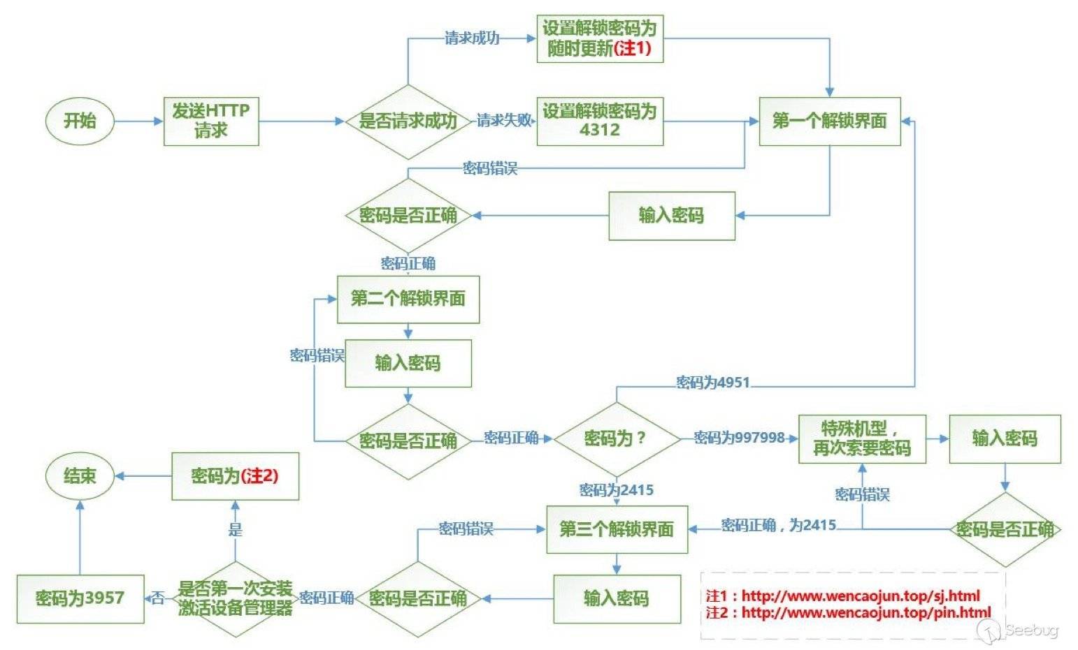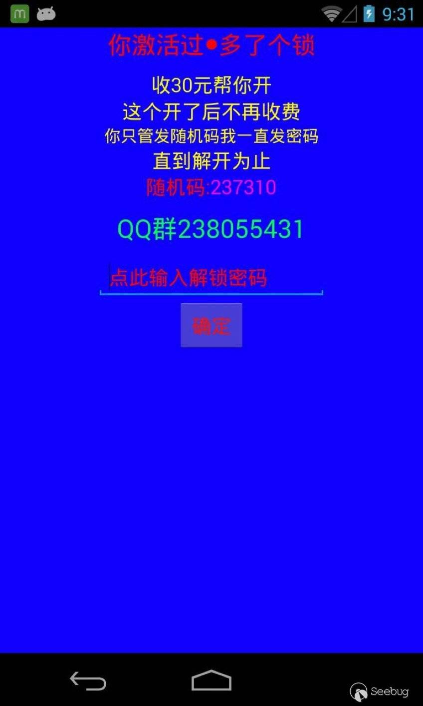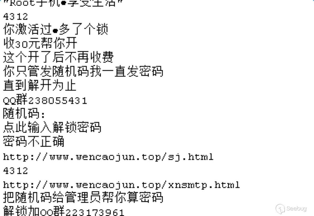 在整個解鎖的流程中,并不如“解鎖管理員”簽名中所述,解鎖只需35元或者40元就可以解除屏幕鎖定。經過測試我們發現,想要解鎖設備至少要有三個密碼才能解鎖。而這些密碼,與解鎖界面中生成的序列號毫無關系,其中有兩個密碼保存在遠程服務器上,管理員可以隨意修改。