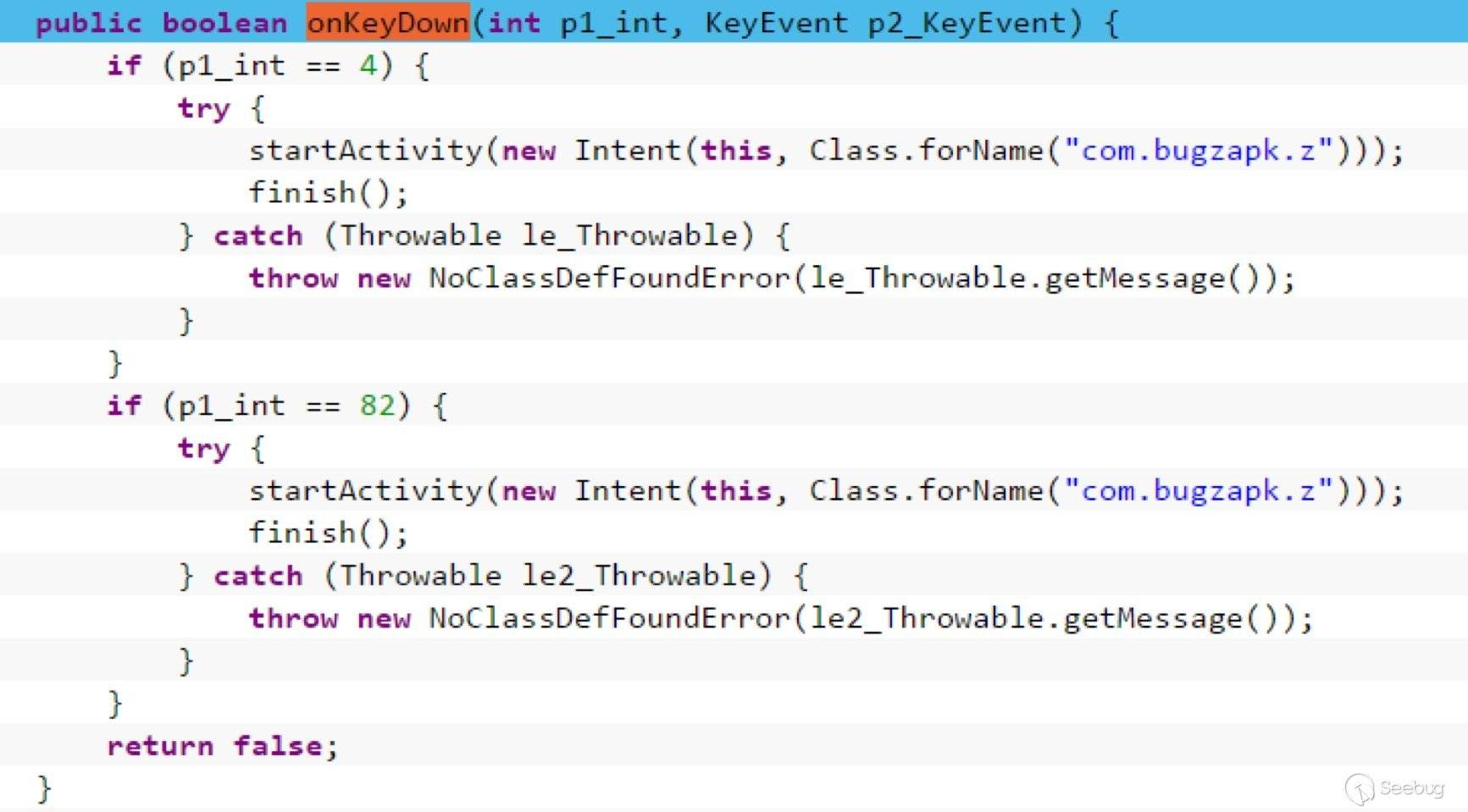 當按鍵為4或82時,執行com.bugzapk.z的代碼。4代表的是返回鍵,82代表的是菜單鍵。代碼中并未出現監控音量鍵、關機鍵等特征代碼。