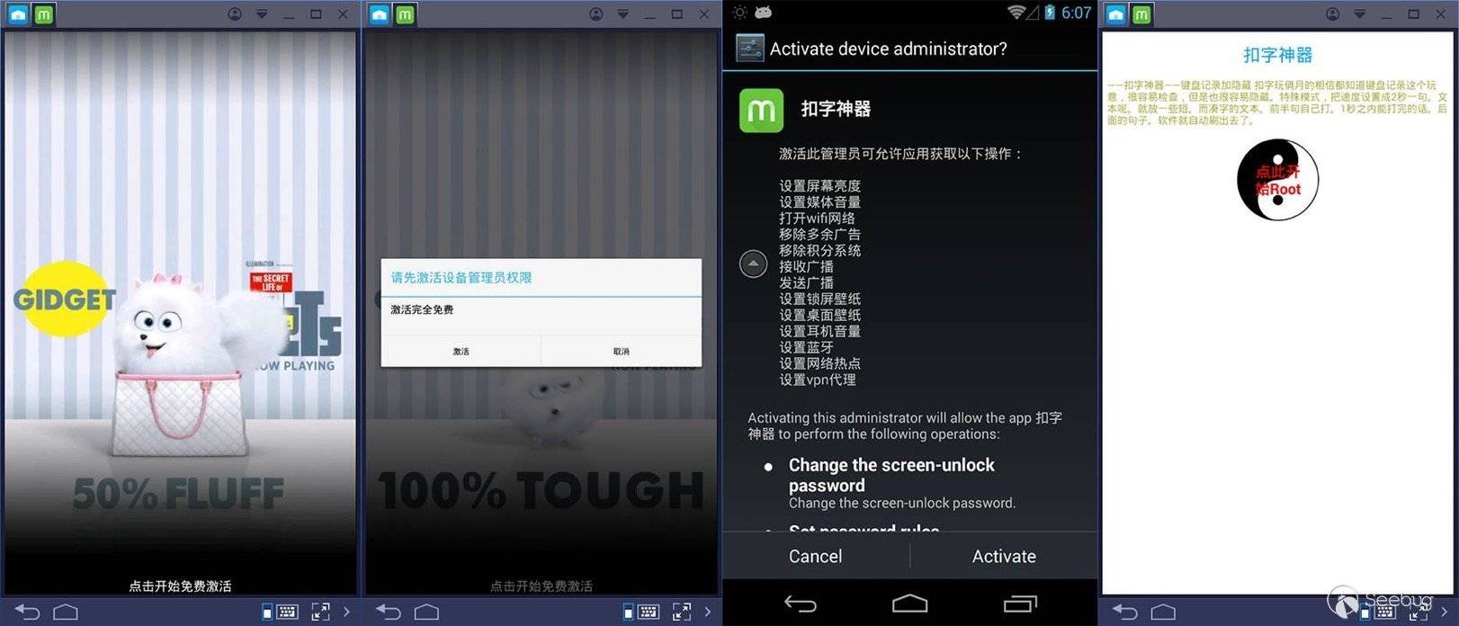 同時第三個界面彈窗詢問是否激活設備管理器,激活后,跳轉到上圖第四個界面。前面的幾個界面看起來都相對可靠,這個界面看著些許不適,風格詭異。