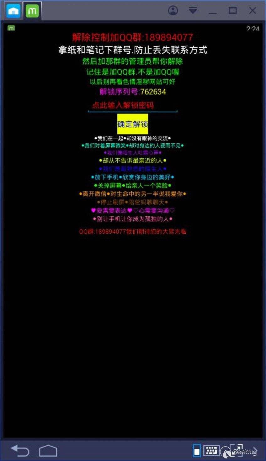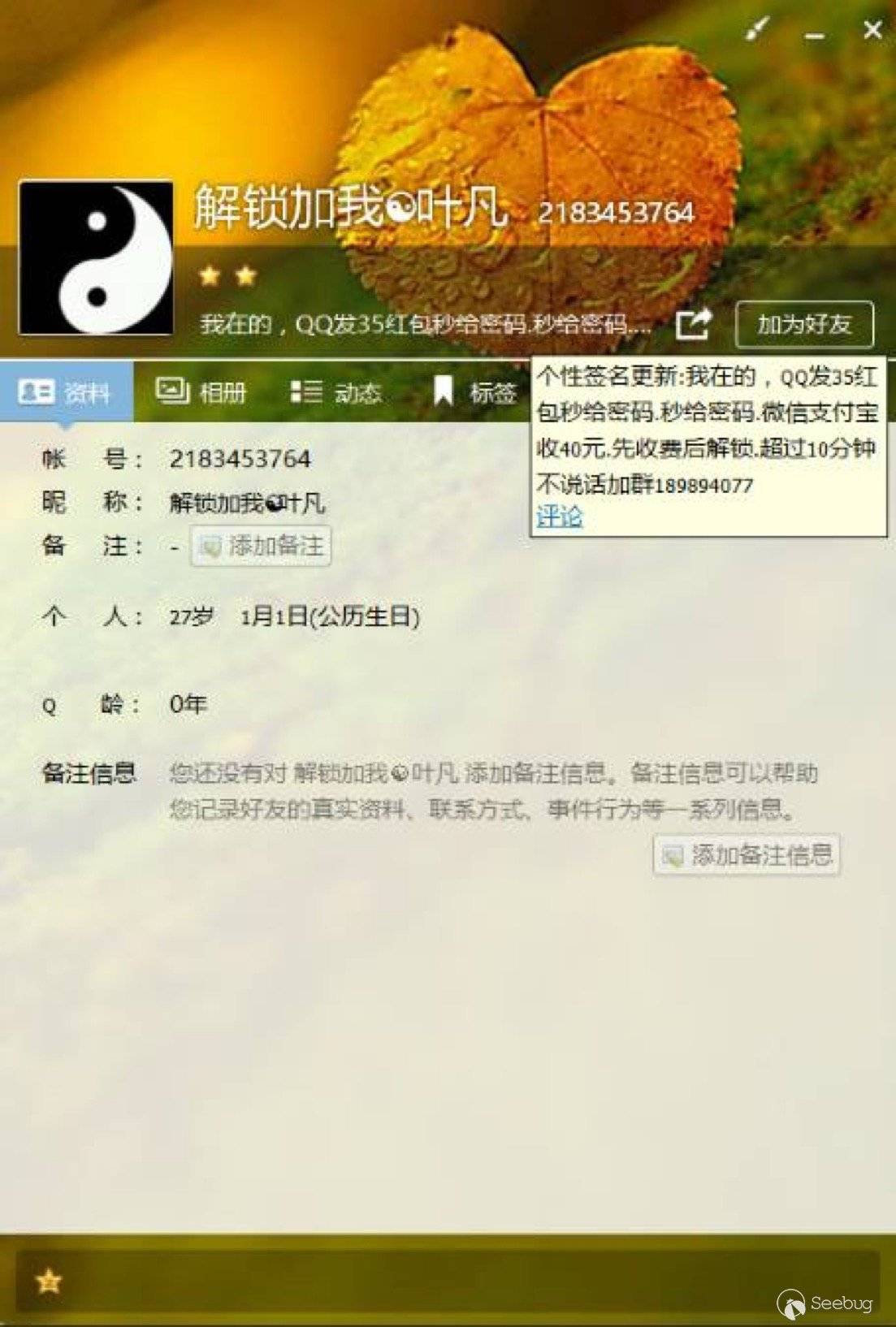 管理員簽名:“想要解鎖自己的手機,需要聯系加QQ群189894077,聯系管理員,QQ紅包35元,微信支付寶40元。”