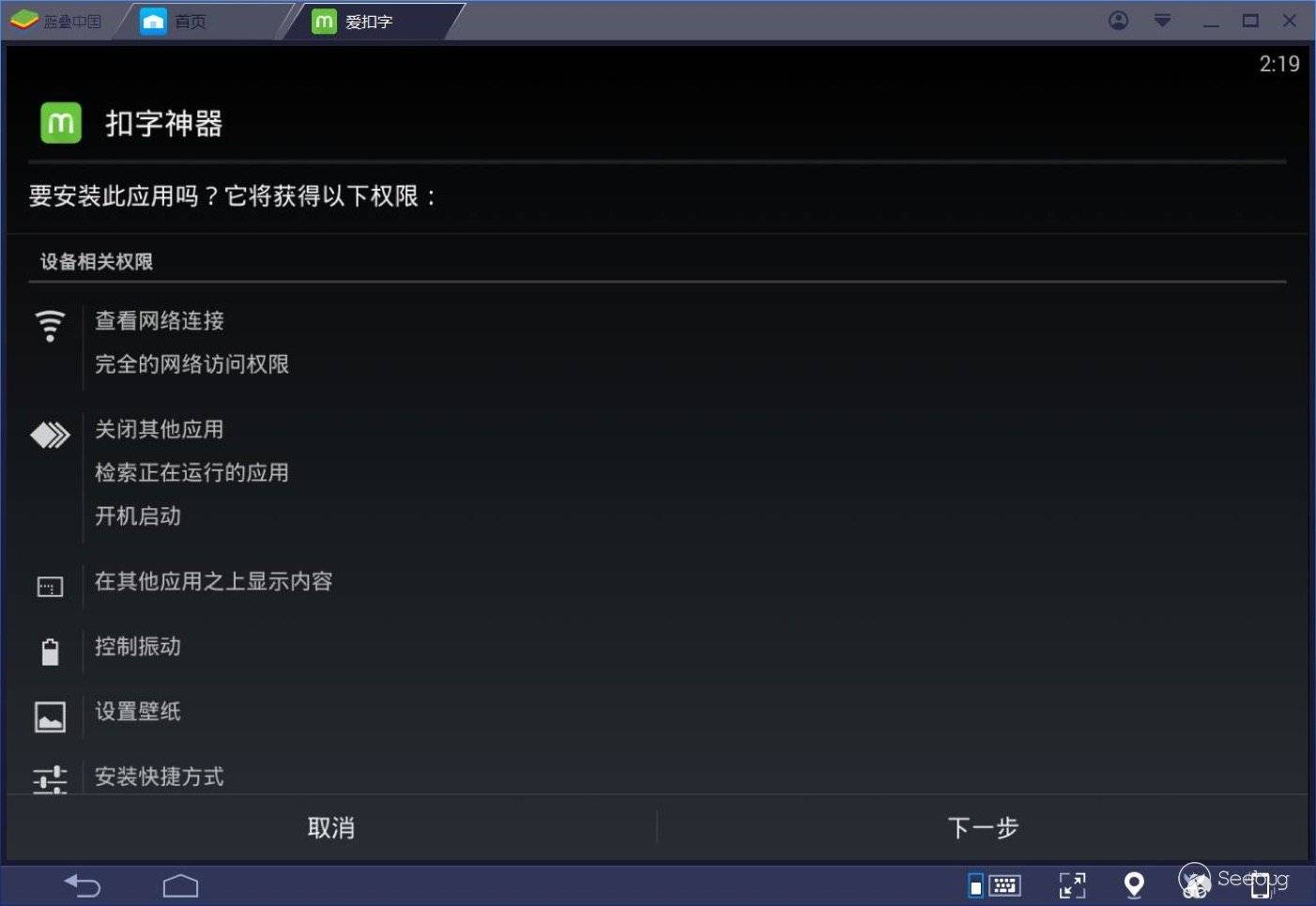 在安裝“愛扣字”應用后,打開應用程序,彈出“扣字神器”的安裝界面,提示安裝“扣字神器”應用。
