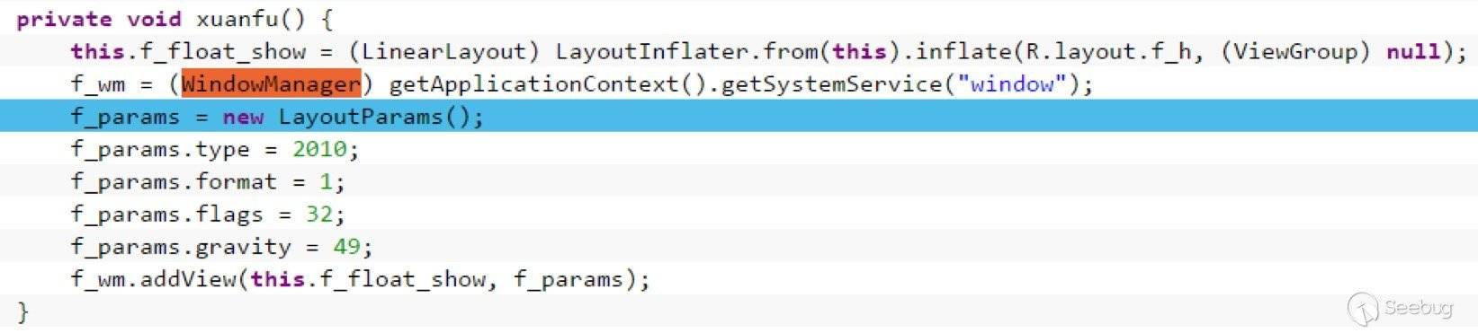 鎖屏類勒索軟件通常利用WindowManager.LayoutParams的flags屬性,設置成某個固定的值,使懸浮窗口懸浮置頂。本文中的惡意應用也利用了同樣的方法。