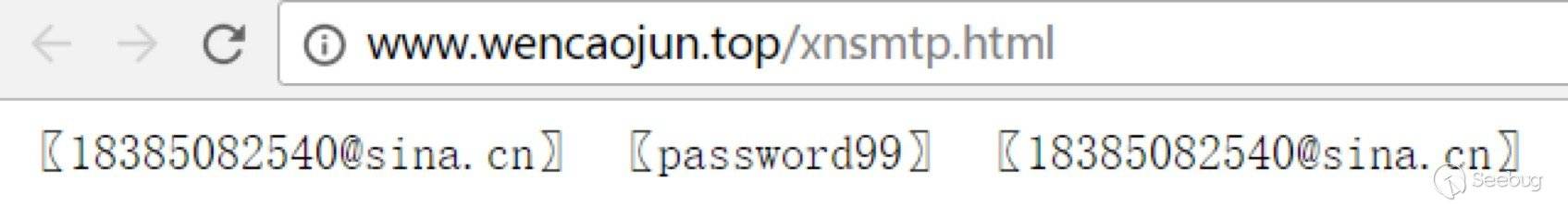 在惡意應用運行的過程中,會主動請求網頁"http://www.wencaojun.top/xnsmtp.html",而網頁中的內容是郵箱和一串類似密碼的字符串。