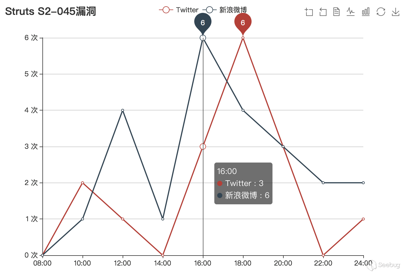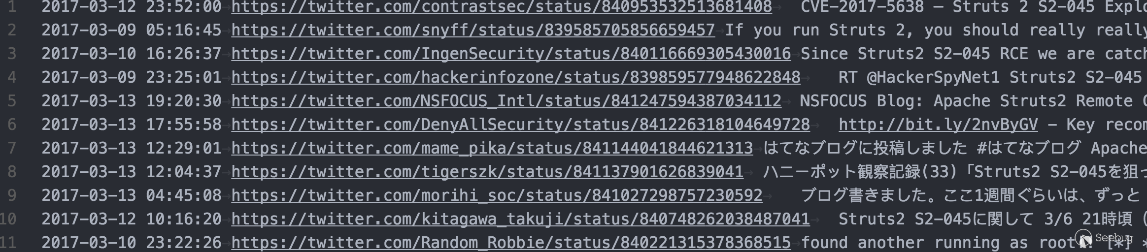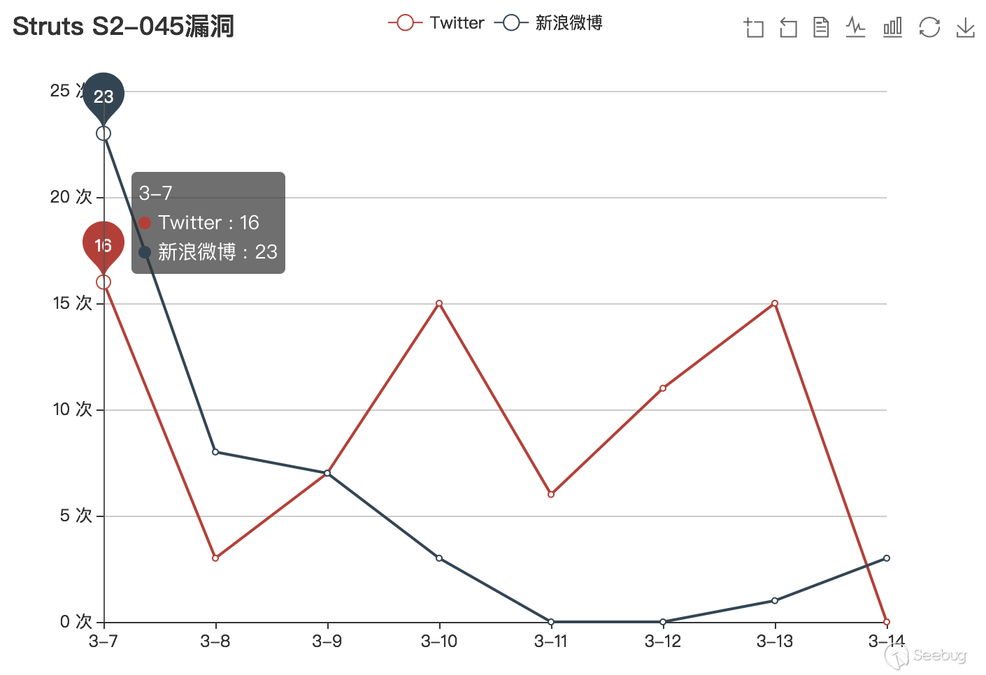 - S2-045漏洞是中國人發現的,3月6日晚間官方公布漏洞后,3月7日上午漏洞的PoC和Exp就在國內互聯網上流出,受到國內安全公司的廣泛關注,這也就能解釋3月7日新浪微博的數據量超過Twitter的現象了;