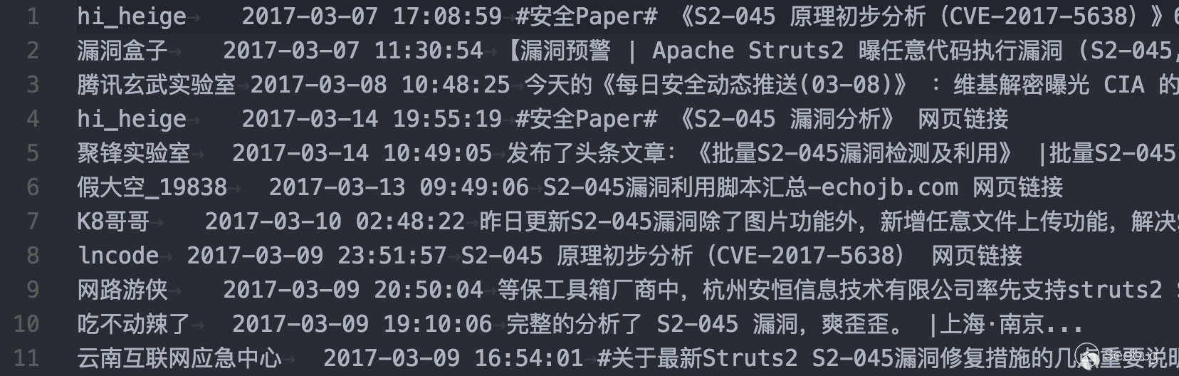 既然要分析Twitter和新浪微博上S2-045漏洞的熱度分布情況,那么就需要獲取Twiiter和新浪微博上的數據,用數據說話。于是就使用“selenium+phantomjs”去爬取數據,通過Twitter和新浪微博web頁面的搜索接口,分別搜索關鍵詞“s2-045”和“CVE-2017-5638”,然后將搜索結果去重并整理,考慮到Twitter和新浪微博時間顯示的時區不一致問題,采用統一抓取頁面時間戳然后轉化為北京時間的方式統一時區問題,爬取數據的時間為2017年3月14日下午18時,結果如下圖所示。