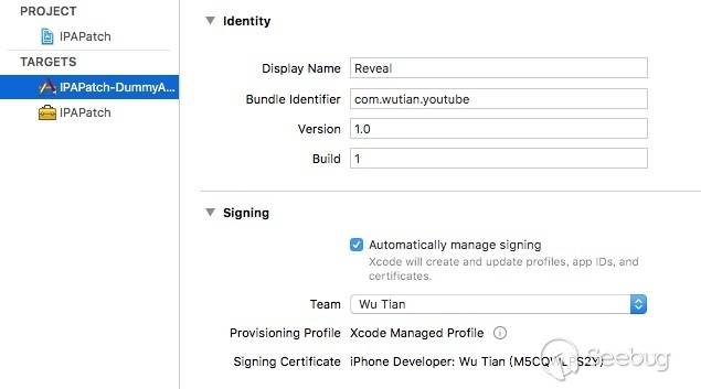 5. 打開 IPAPatch,在 IPAPatch-DummyApp 這個 Target 里,配置好 BundleID 和代碼簽名。Display Name 會作為前綴添加到原來的 App 上,如圖配置的話最后就是 "RevealYoutube"
