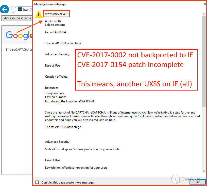 幾個月前我們研究過 Edge 瀏覽器上的無域的about:blank頁面問題。強大的 about:blank document 基本上能夠無限制訪問任何域。該漏洞近期得以修復(CVE-2017-0002)。因此現在它已不再生效。同樣的事情發生在了ActiveXObject/htmlFile (現在的 htmlFile) 上,?上周也被修復了(對應CVE-2017-0154)。