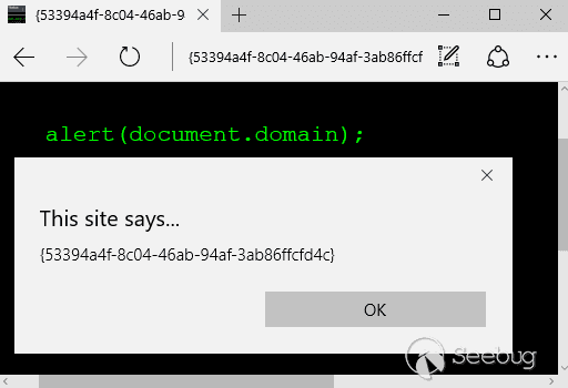 最初的問題來自于無域的頁面(URL about:blank 對應 document.domains 是空的),基本能夠訪問任何 document 源的 DOM,但是 Microsoft 通過向他們添加一個隨機域(GUID)。也就是說,無域的 blank 已經不再是無域的了。它們總像是 {53394a4f-8c04-46ab-94af-3ab86ffcfd4c} 這種隨機域。
