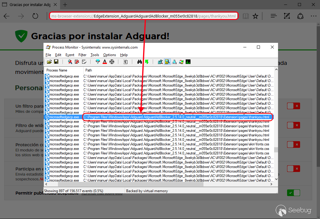 啟動 Process Monitor,過濾 MicrosoftEdgeCP.exe。關閉 Edge,并通過復制到地址欄的方法打開 AdGuard 感謝頁面,Bang!我們馬上就能在 Process Monitor 中看到文件所在的位置。記住,我們的目標是從這個擴展程序中找出一個圖像,看看能否加載它,并通過 onload/onerror 檢測其存在。