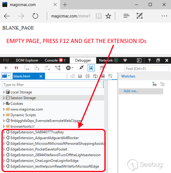 另外,你有沒有注意到我們使用的URL甚至沒有指向特定資源?這個 xml技巧與目錄名有關,甚至不需要指向擴展程序的特定資源,所以現在有插件的 ID 就足以進行檢測了。如果要構建一個通用探針來查找已經安裝的擴展程序,就像我們在 Chrome 和 Firefox 中見過的這種,首先要再 Edge 上安裝所以的擴展程序,并記下所有的 ID。這頗為簡單,只需要安裝擴展程序,加載空白頁,按下 F12,就足以展現插件的 ID。我已經安裝的其中的幾個,在下方清晰可見。