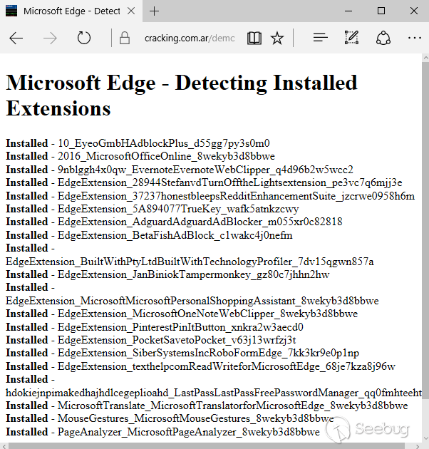 攻擊者喜歡收集受害者的指紋特征。我們之前已經見識了兩種技術,壞人可以通過檢測特定文件(來逃避分析人員),甚至可以獲取特定關聯應用的名稱。Microsoft 修補了諸如此類的特性,而今天我們會看到如何在 Edge 上檢測安裝的瀏覽器擴展程序。